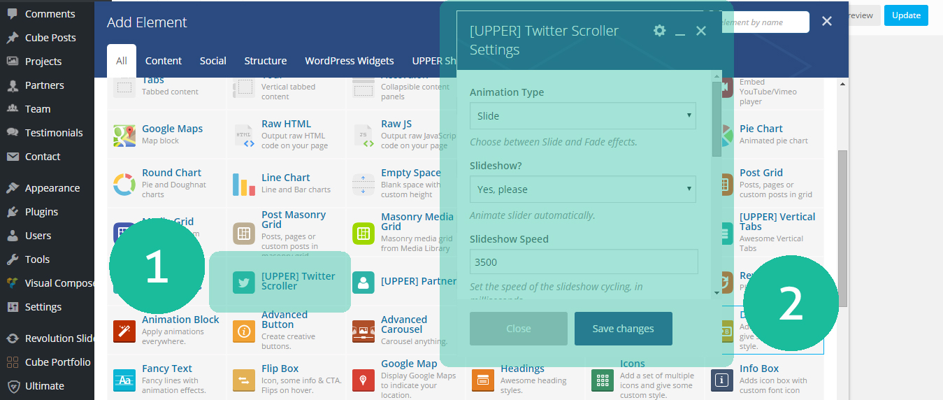 - 1. Open Visual Composer plugin from inside any page you are creating, and select Upper Twitter Scroller.